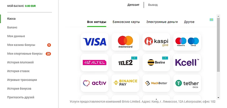 В пользовательском соглашении прописано ограничение на вывод до 5 000 евро в месяц, если общая сумма выигрышей превышает ваши депозиты в 20 или более раз. Максимальный размер одной транзакции 9 000 евро. Букмекер может взимать с игроков комиссию до 20% от суммы вывода, если оборот средств меньше двойного размера депозита.