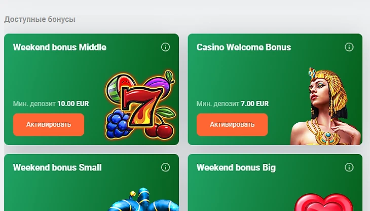 За регистрацию аккаунта пользователь получает приветственный бонус 100% за депозит. Минимальная сумма пополнения 10 евро. Максимальный размер вознаграждения 100 евро. Можно воспользоваться персональным предложением +150% к депозиту от 5 евро и страховку до 10 евро. Максимальное вознаграждение 100 евро. Отыгрыш бонуса с множителем х22 в течение 14 дней. В зачет идут одиночные ставки с коэффициентом от 1,75.