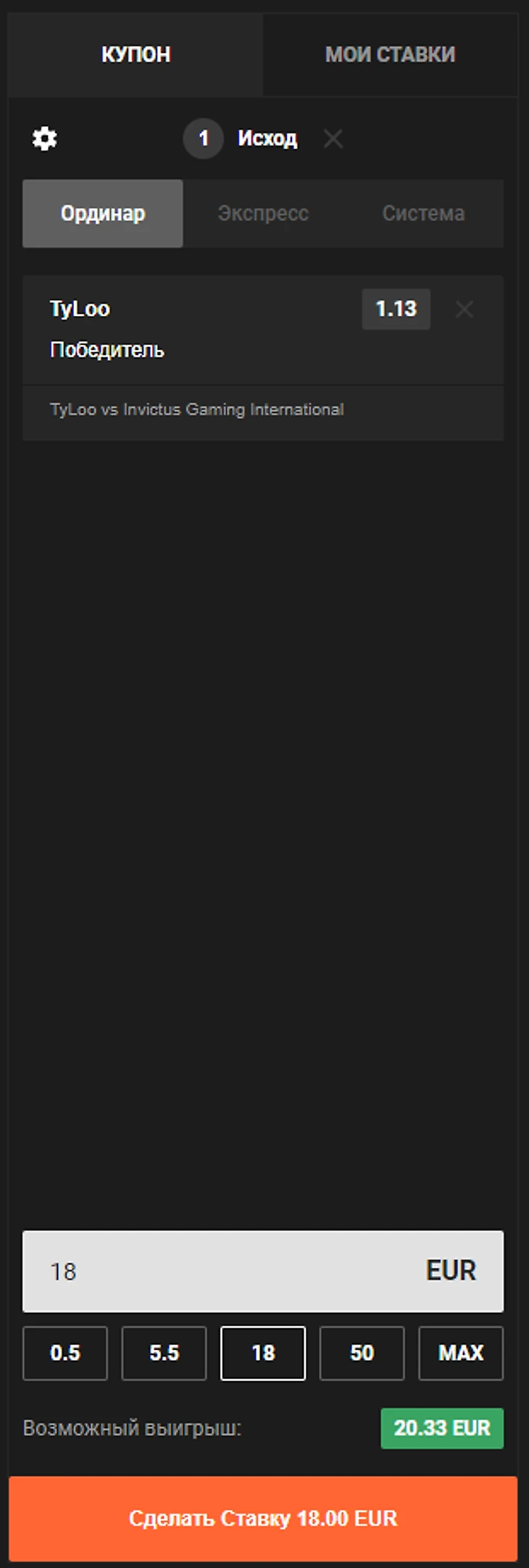 Букмекер принимает три вида ставок: одинар, экспресс и система. Для размещения ставки необходимо: