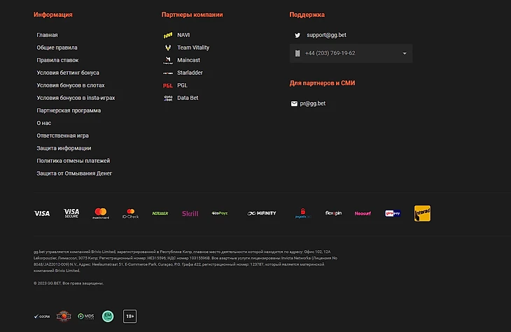 В нижней части сайта перечислены все виды спорта, на которые можно делать ставки. Их более 30. Есть ссылки на правила БК, список платежных систем, партнеров, контакты для связи.