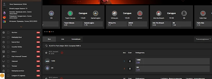 В левом углу находится линия. В ней перечислены все дисциплины для ставок на спорт. Отдельно выделены лучшие турниры. Можно создать собственный топ, выделив турниры в «Избранное». В центральной части находится информационный блок о турнирах, бонусах и акциях. Ниже идет роспись различных событий. В правом углу находится купон и ваши ставки.
