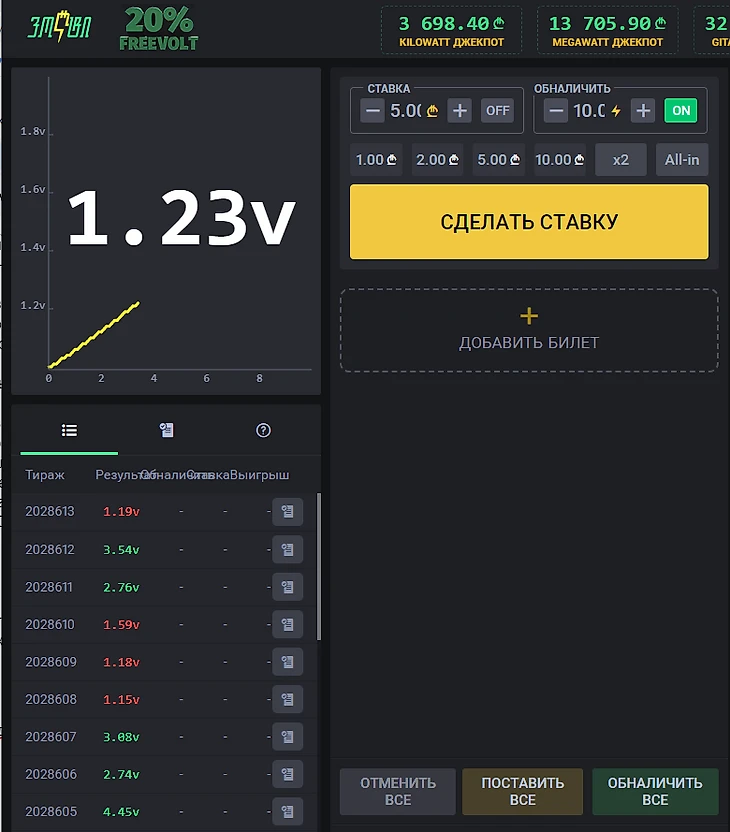 Вольт. Аналог игры Aviator. Пользователь делает ставку и ему необходимо забрать выигрыш до того момента, пока не оборвется линия возрастающего графика.