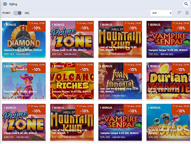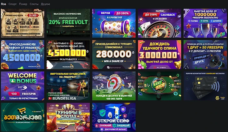 Настольные игры. Представлены четыре игры: бура, нарды, домино и джокер. Букмекер предлагает бонусную акцию, в рамках которой можно выиграть часть призового фонда в размере 100 000 лари и 1 000 000 фриспинов.