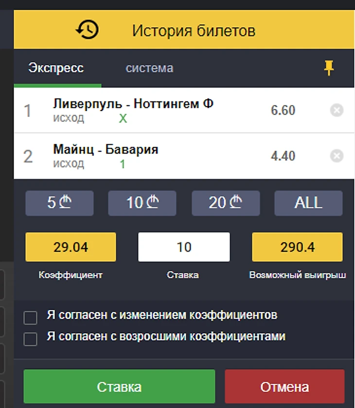Экспресс — комбинированная ставка на два и более разных событий, все коэффициенты умножаются в купоне;