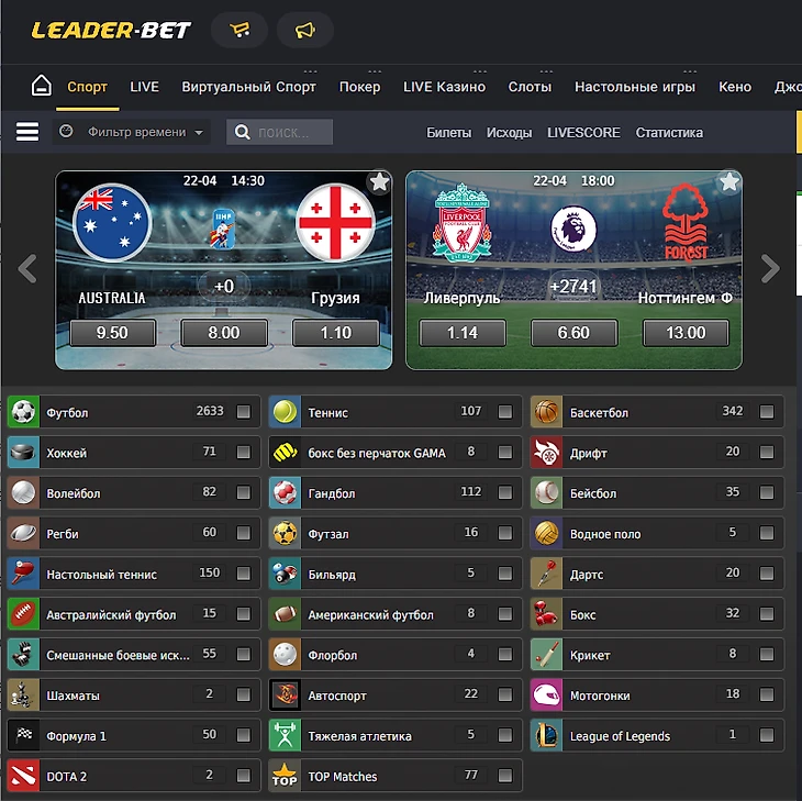 В линии букмекерской конторы Lider Bet есть раздел «Топ матчи». В него попадают топовые игры из разных видов спорта.