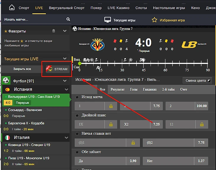 В режиме Live можно выбрать те матчи, на которые доступна трансляция на сайте.