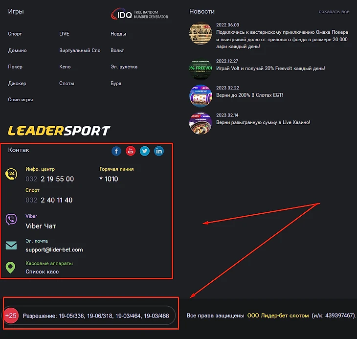 Букмекерская контора работает от имени компании ООО «Лидер-бет Слот» по лицензии Службы доходов Министерства финансов Грузии №19-05/336, 19-06/201.