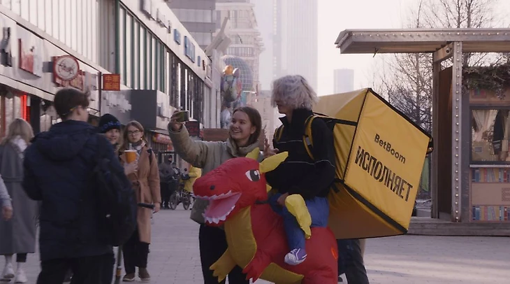 Букмекерская компания BetBoom запустила доставку. На улицах был замечен курьер с брендингом букмекера, но что находится в сумке осталось неизвестным. Также удивительно, что курьер был в странном костюме дракона.