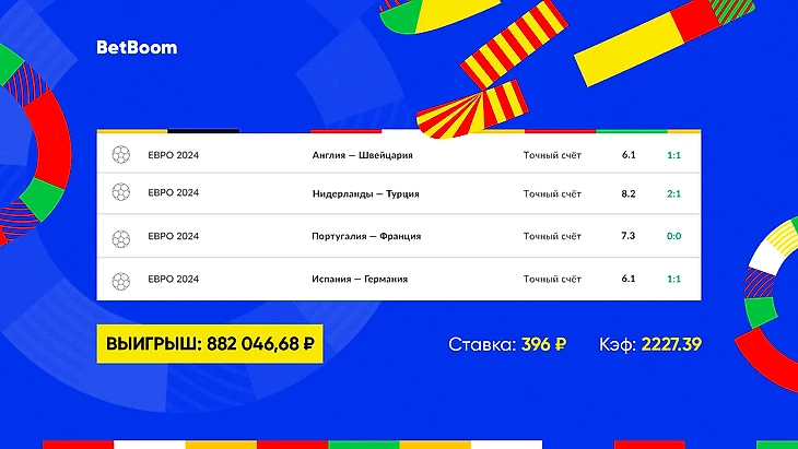 Беттор поставил 396 рублей и выиграл 882 тысячи, угадав точный счет 4 матчей Евро-2024