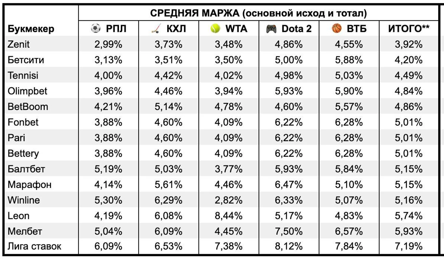 В топ-3 по минимальной маржинальности в России также входят БЕТСИТИ (4,20%) и «Тенниси» (4,49%). Самая большая маржа у «Лиги Ставок» – 7,19%.