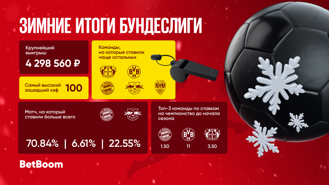 BetBoom подвел итоги середины сезона в Бундеслиге – 4 300 000 рублей выигрыша с одной ставки и зашедший ординар с коэффициентом 100!