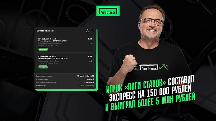 Игрок «Лиги Ставок» составил экспресс на 150 000 рублей и выиграл более 5 млн рублей