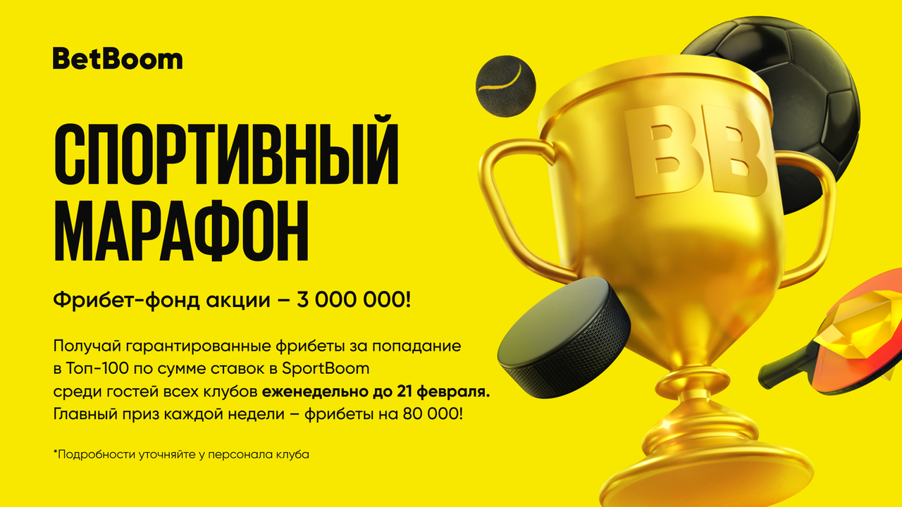 C 31 января в клубах BetBoom по всей России начинается захватывающее спортивное приключение — акция «Спортивный марафон». Гостей ждет соперничество, щедрые награды и незабываемые эмоции! Каждый, кто войдет в ТОП-100 участников, получит фрибеты из призового фонда в 1 000 000 рублей по итогам одного из трех этапов.