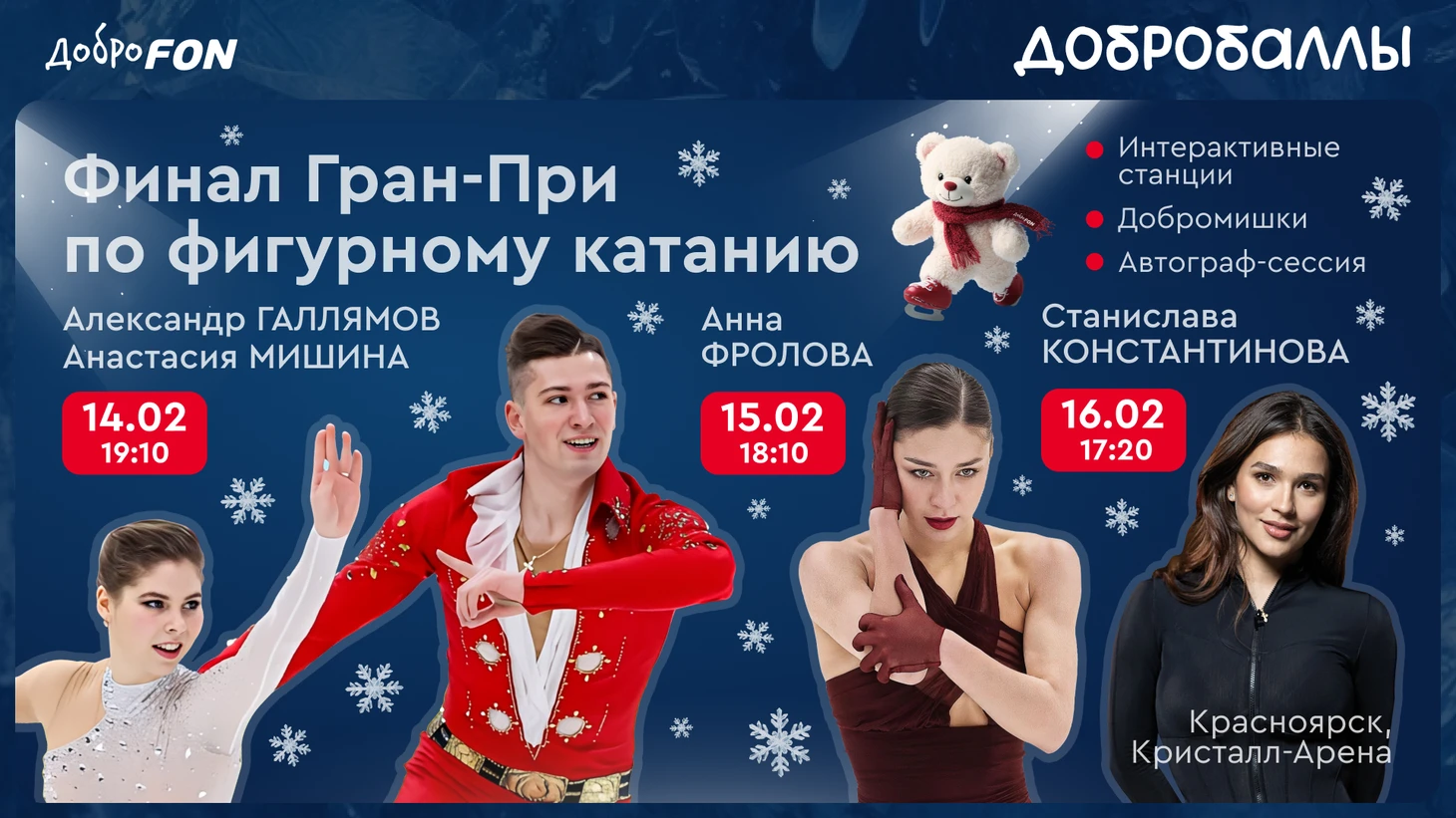 В рамках финала отечественного Гран-при по фигурному катанию в зоне ДоброFON, расположившейся рядом с 10 сектором в фойе красноярского ледового дворца «Кристалл арена», зрителей ждут автограф-сессии с любимыми спортсменам и интерактивная зона с двумя станциями, где каждый сможет почувствовать себя настоящим фигуристом и начать творить добрые дела, зарабатывая Добробаллы.