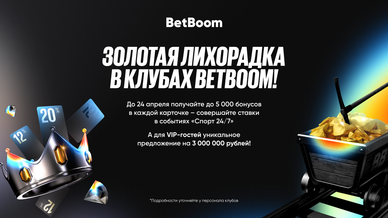 С 7 апреля в клубах букмекерской компании BetBoom снова запустилась акция «Золотая лихорадка» для всех гостей. Если вы пришли в первый раз то, по промокоду «BBGOLD» вас ждет бездепозитный фрибет 3 000. За активные ставки на события из раздела «Спорт 24/7» гости клубов будут получать бонусные карты, в которых скрывается до 5 000 бонусов. Акция пройдет в два этапа — до конца мая. Вознаграждение зависит только от вашей активности: чем больше ставок — тем больше карточек с бонусами.