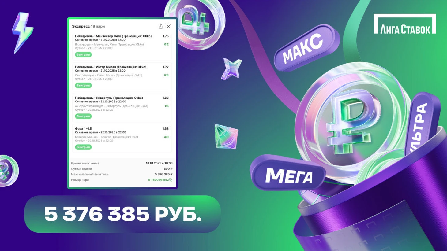 Пользователь «Лиги Ставок» собрал экспресс из 18 матчей, в который вошли матчи Лиги чемпионов и европейских чемпионатов. Он поставил 500 рублей на огромный коэффициент 10 752 и выиграл 5 376 385 рублей.