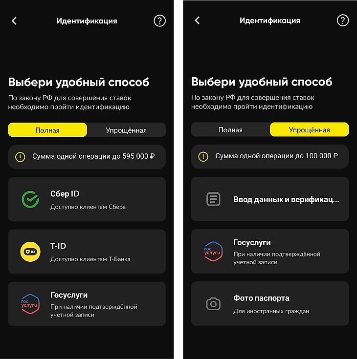 После прохождения упрощенной идентификации игрок может единоразово вносить на свой игровой счет до 60 000 рублей и до 200 000 рублей в месяц. При полной идентификации лимит на одно пополнение увеличивается до 595 000 рублей в зависимости от способа пополнения или снятия.