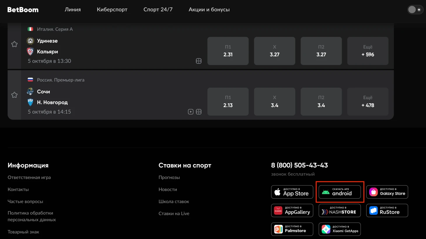Скачать BetBoom на Андроид также можно через официальный сайта букмекера при помощи компьютера или ноутбука. Пролистайте главную страницу в самый низ и кликните на кнопку «Скачать APK Android». Установочного файл будет скачан и по умолчанию добавлен в «Загрузки». Вы можете перекинуть его на ваше мобильное устройство.