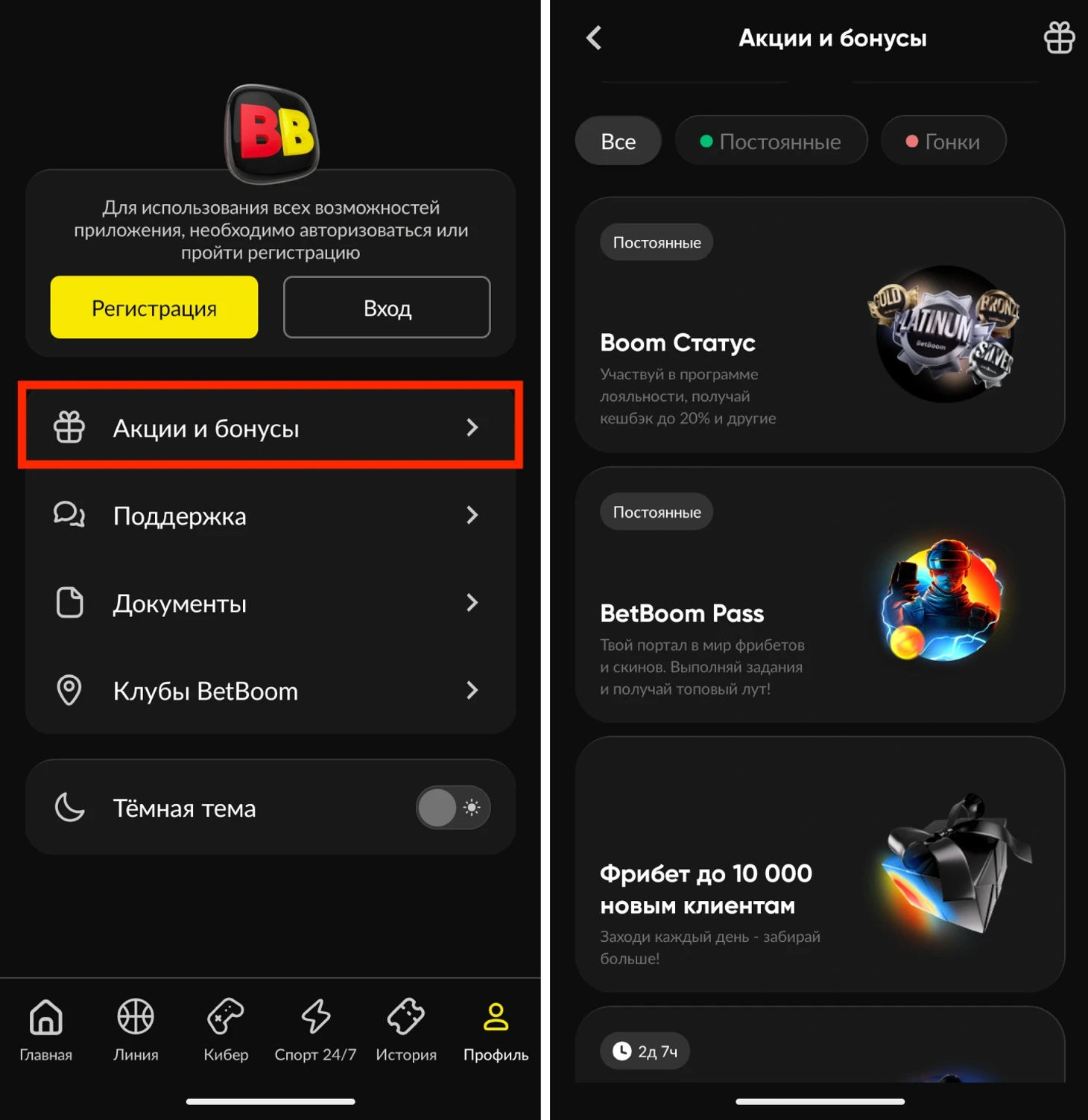 В настоящий момент всем новым клиентам доступен приветственный фрибет до 10 000. Букмекер время от времени обновляет приветственные бонусы для новых игроков, а также проводит регулярные акции для действующих клиентов с различными механиками и условиями получения. Найти полный список можно в одноименном разделе в главном меню мобильного приложения букмекера.