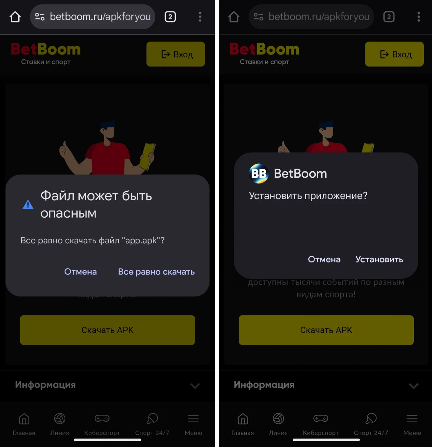 загрузить apk-файл на ваше мобильное устройство с официального сайта BetBoom;