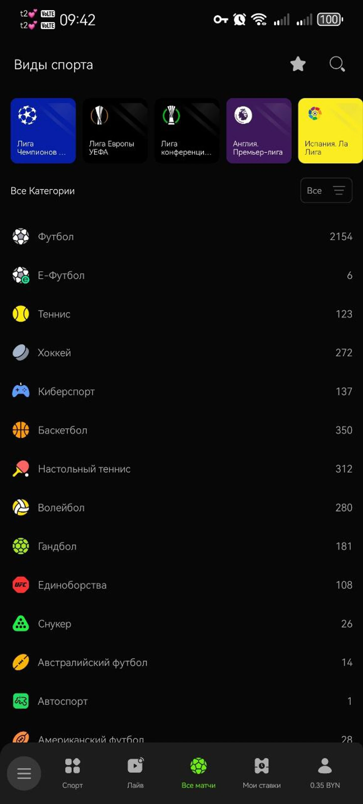 Для перехода к прематч-событиям нужно выбрать пункт «Все матчи». На открывшемся экране можно указать конкретную спортивную дисциплину. В верхней части экрана в разделе «Виды спорта» указаны наиболее популярные у болельщиков турниры.