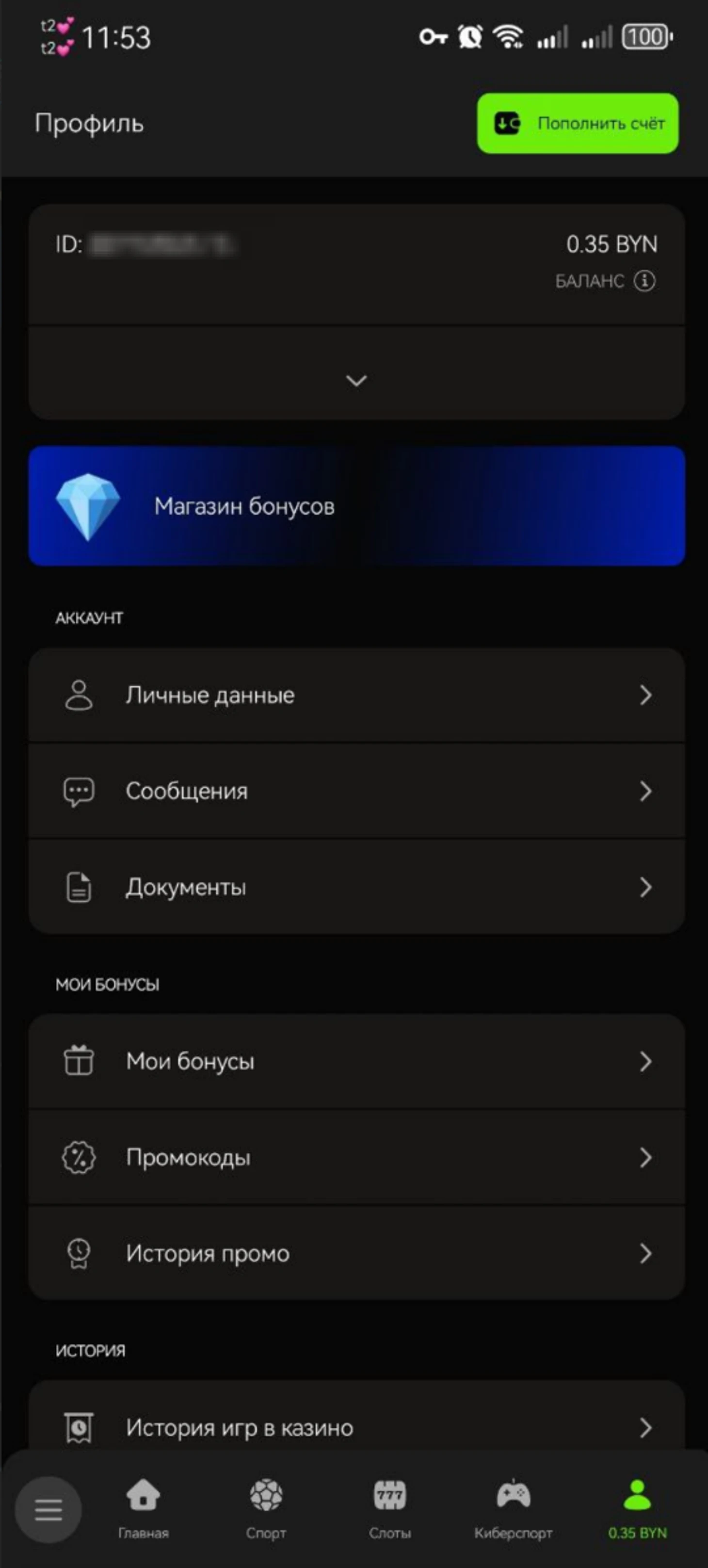 Через меню личного кабинета можно отследить историю участия в бонусных предложениях, для чего нужно нажать на кнопку «История промо», ввести бонус-код для действующих игроков можно в разделе «Промокоды», а через раздел «Мои бонусы» происходит активация подарков, которые впоследствии можно использовать для ставок на спорт или игру в онлайн-казино. Бетторы через приложение пополняют игровой баланс и оставляют заявку на вывод выигрыша.