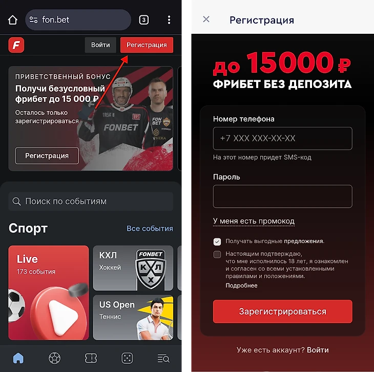 Зарегистрироваться и получить фрибет до 15 000 рублей без депозита;