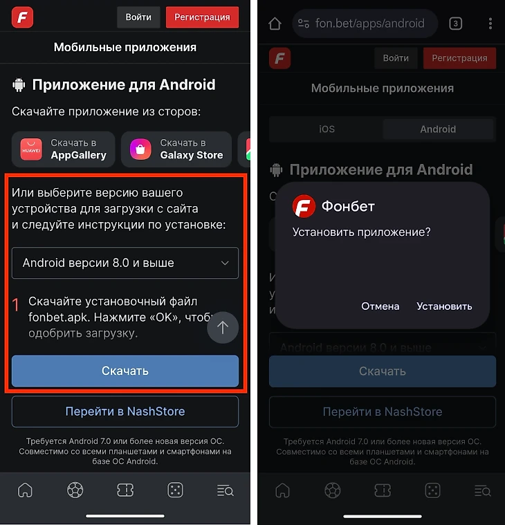 Для загрузки установочного apk-файла с сайта букмекерской конторы «Фонбет», необходимо выполнить следующие действия: