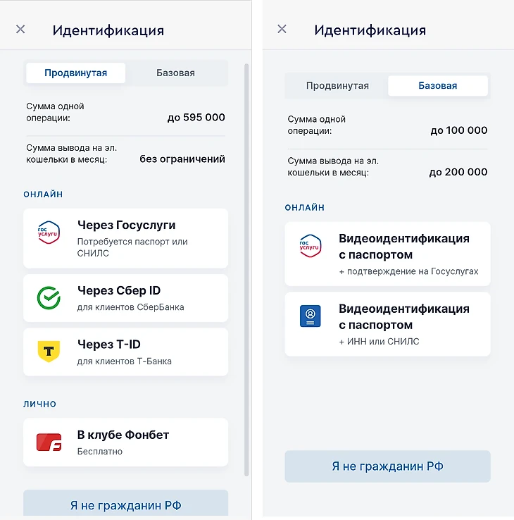 После прохождения упрощенной идентификации игрок может пополнять баланс на сумму с лимитом до 60 000 рублей за один раз и до 200 000 рублей в месяц. При полной идентификации лимит на одно пополнение увеличивается до 595 000 рублей в зависимости от способа внесения средств.