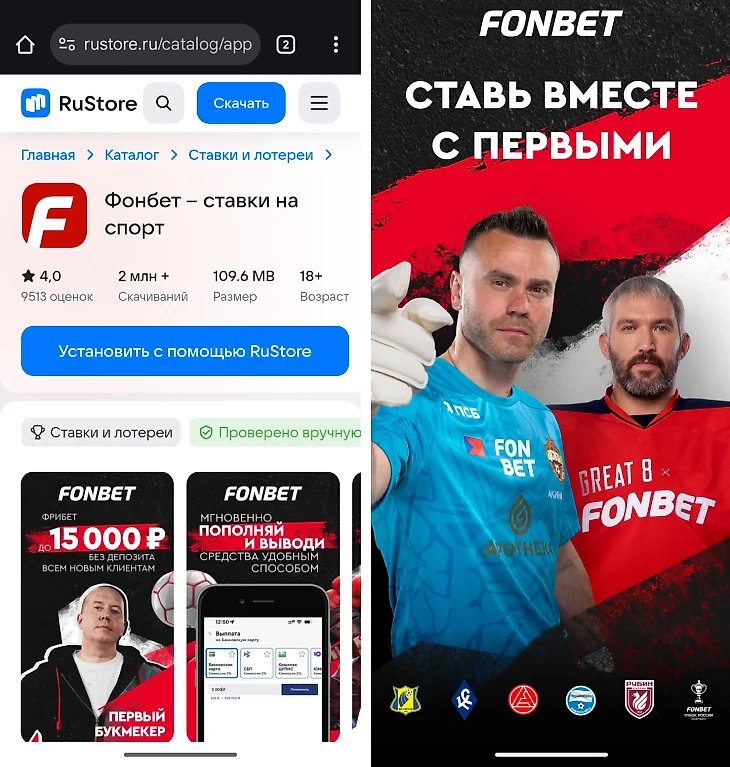 Далее подробно рассмотрим процесс установки приложения через магазин RuStore. Для начала необходимо установить приложение самого магазина RuStore на ваш смартфон или планшет. После установки воспользоваться поиском по названию букмекерской конторы – Фонбет или Fonbet.