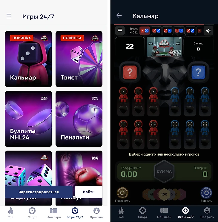 У игроков есть доступ к большинству игр 24/7 в течение всех суток. Среди доступных вариантов есть более традиционные виды спорта – дартс, нарды, бокс. Есть и любопытные новинки, одна из таких – стилизованная под сериал игра «Кальмар». Попробуйте!