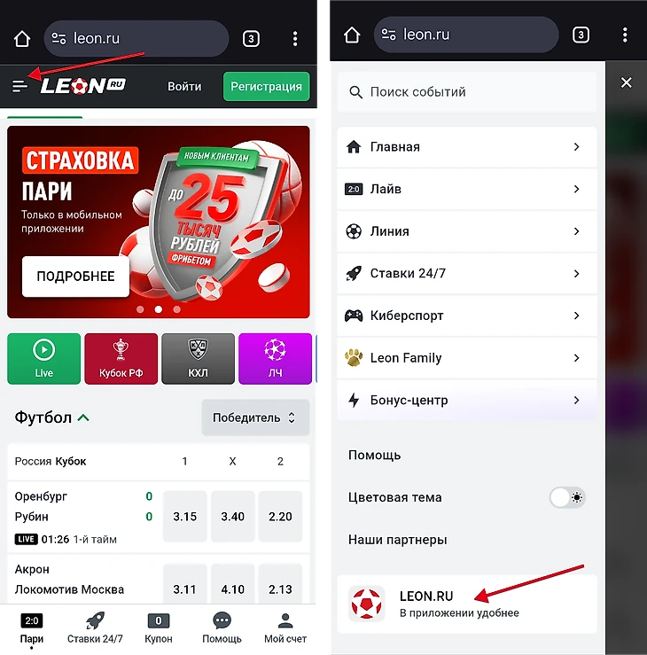В открывшемся меню нажмите на пункт «LEON.RU В приложении удобнее».