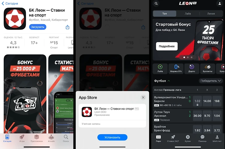 Мобильное приложение букмекерской конторы «Леон» на iOS можно скачать и установить напрямую через магазин App Store или с помощью официального сайта букмекера. Новым пользователям предусмотрена 100% старховка первой ставки до 25 000 рублей (только в мобильном приложении БК).