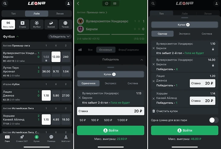 При положительном балансе игроки могут совершать ставки. В приложении «Леон» доступны три вида ставок: одинар, экспресс и система. Выбрать вид можно в купоне.