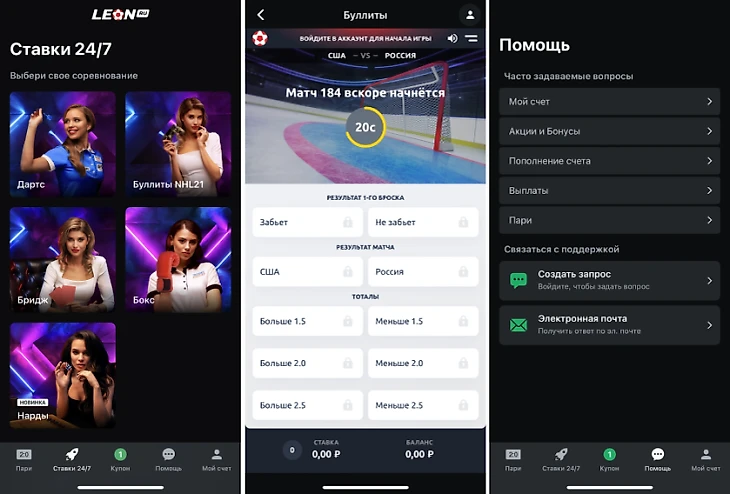 В разделе «Ставки 24/7» представлены быстрые игры. В приоложении «Леон» можно делать ставки на дартс, бридж, нарды, бокс и буллиты NHL21.