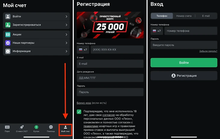 В приложении БК «Леон» есть гостевой вход. Если у вас нет учетной записи, то ее необходимо создать. Для перехода к регистрационной анкете необходимо нажать на «Мой счет» в нижнем правом углу и выбрать «Зарегистрироваться».