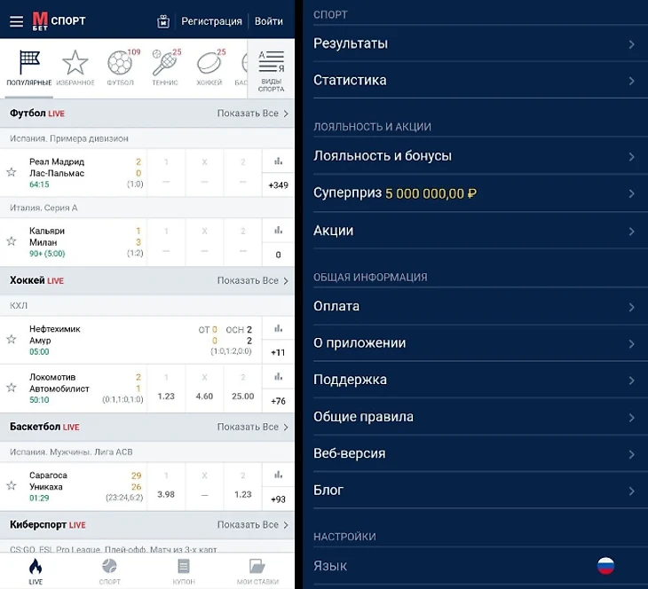 При входе в приложение игрок попадает на страницу с Live-событиями. При помощи кнопок на нижней панели можно перейти к прематчевой линии («Спорт»), в купон ставки и к истории пари. Последние два раздела доступны только авторизованным пользователям.