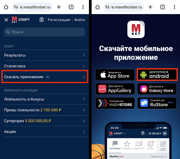 Источник для скачивания: Marathonbet.ru, AppGallery, Galaxy Store, RuStore, NashStore