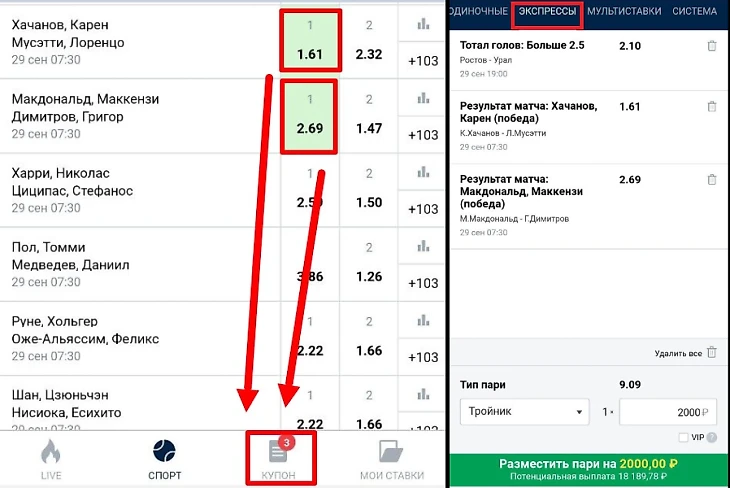 В линии выбраны еще два события. Оба добавлены в купон. Пример экспресс-ставки из 3 событий с общим коэффициентом 9.09. Вверху выбран тип ставки, внизу указана сумма – 2000 рублей.