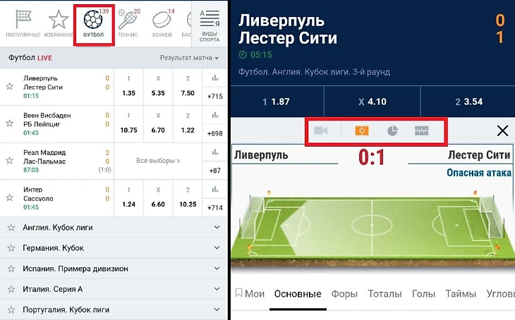 Страница футбольного матча в лайве. Красным цветом выделены иконки переключения режимов отображения хода событий. Левее всего – иконка видеокамеры.