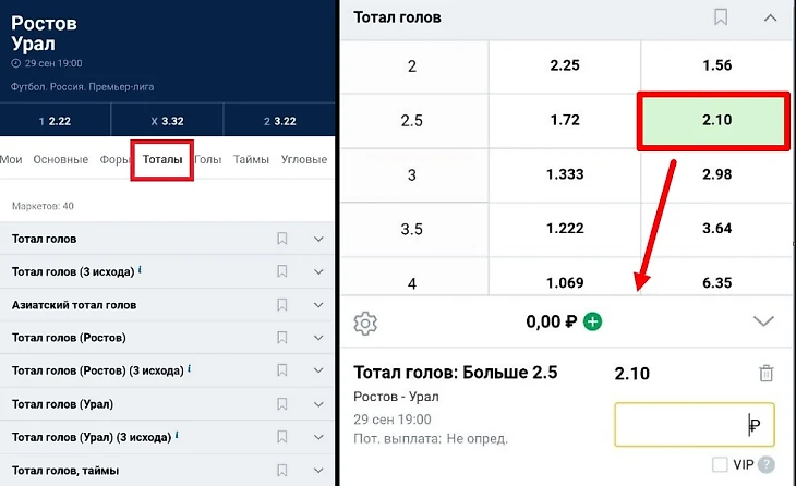 На странице матча «Ростов» – «Урал» выбрана вкладка «Тоталы». Отображаются все ставки на матч, связанные с тоталом. Выбрана ставка на ТБ (2,5) за кф. 2.1. Исход добавлен в купон.