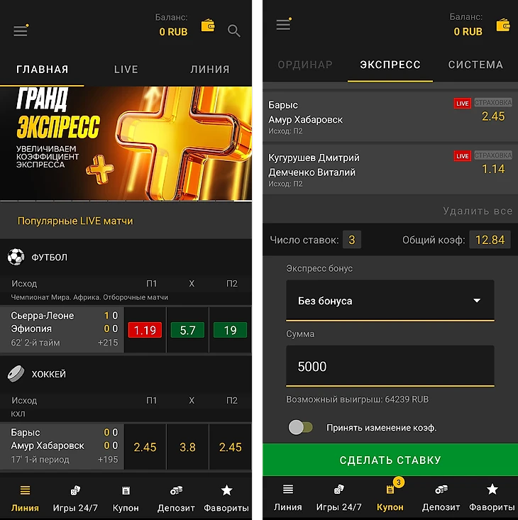 После пополнения счета игрок может совершать ставки в приложении. Игрокам доступны три типа ставок: одинар, экспресс и система. Выбрать формат ставки можно в купоне.