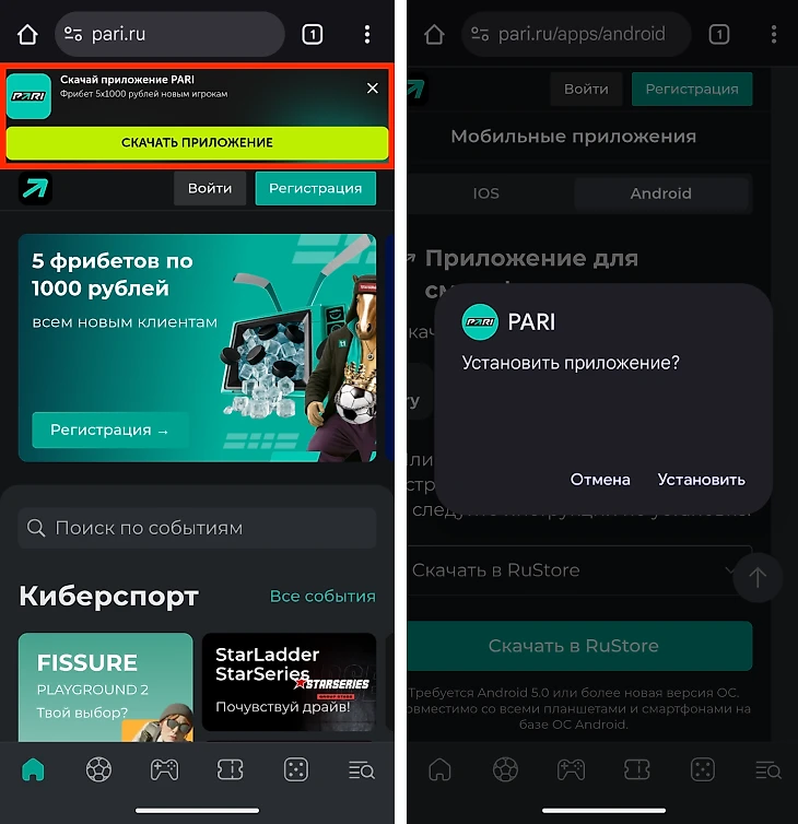 Приложение БК PARI для Android доступно для скачивания напрямую через официальный сайта букмекера или через сторонние магазины приложений. Все новые клиенты букмекера могут получить 5 фрибетов по 1 000 рублей при регистрации в мобильном приложении PARI по ссылке на нашем сайте.