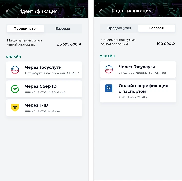 После прохождения упрощенной идентификации игрок может единоразово вносить на свой игровой счет до 60 000 рублей и до 200 000 рублей в месяц. При полной идентификации лимит на одно пополнение увеличивается до 595 000 рублей в зависимости от способа пополнения или снятия.