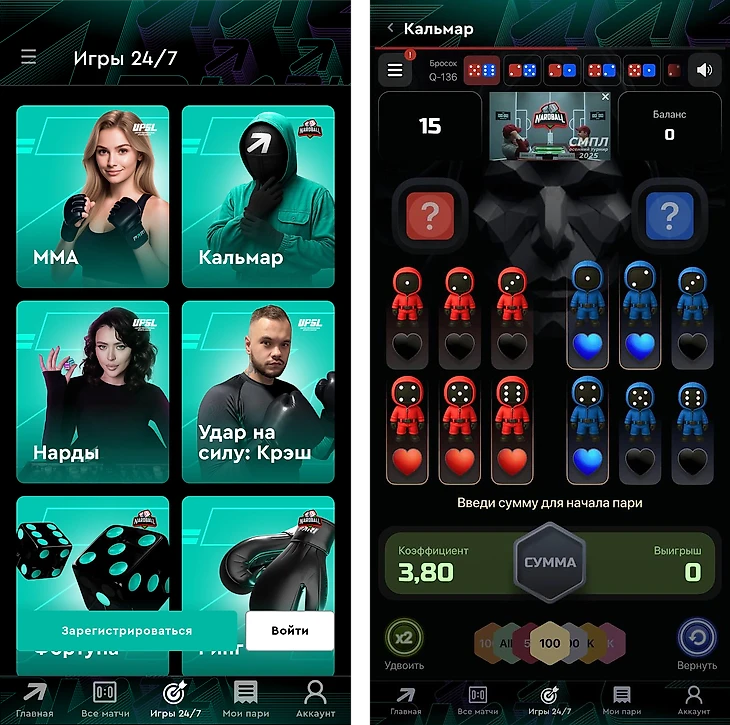 Среди доступных вариантов есть более традиционные виды спорта – дартс, нарды, бокс. Есть и любопытные новинки, одна из таких – стилизованная под сериал игра «Кальмар».