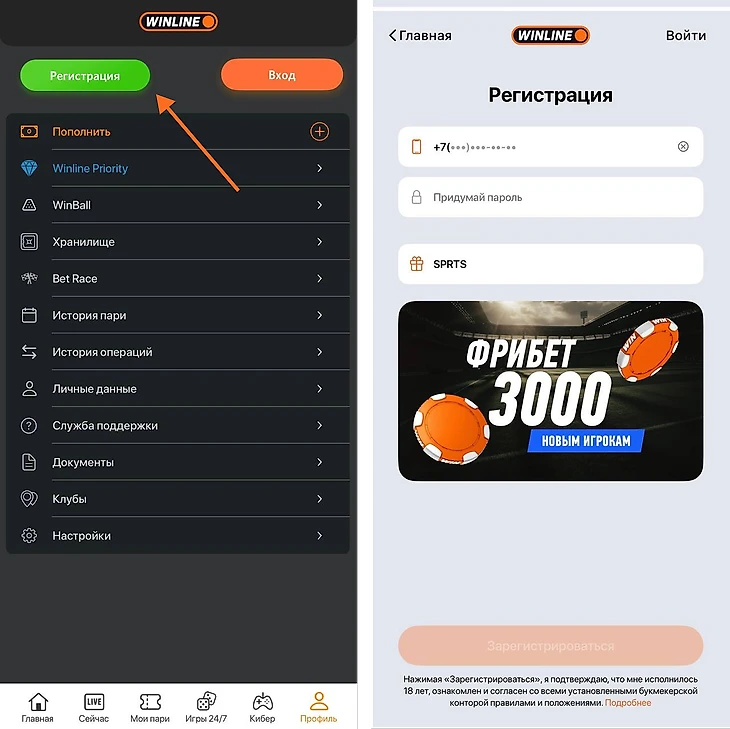 После установки приложения и/или регистрации и входа в личный кабинет вы получаете возможность использовать весь функционал БК WINLINE. Процесс регистрации, к слову, ничем не отличается от аналогичной процедуры в браузерной версии сайта букмекера.