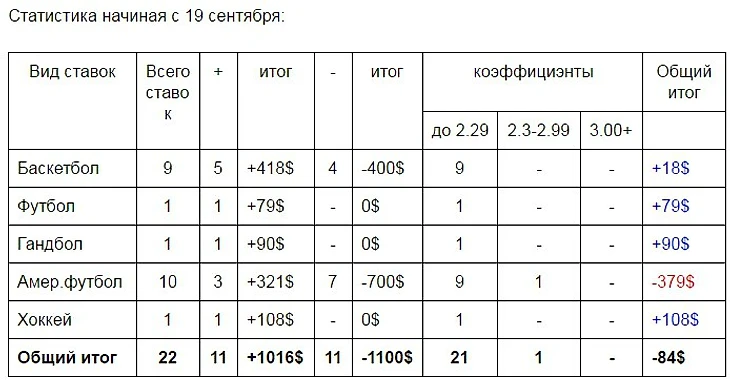 Общий итог был небольшой минус, проходимость ставок была 50%, единственным минусовым видом спорта оказался Американский футбол, я под конец той недели попал в тильт и на эмоциях испортил концовку и дал два дня минусов, при этом 6 ставок в амер.футболе были без описания и я тогда поспешил, как видим результатов это не дало, с +435 на 23 сентября в итоге мы ушли в небольшой минус. Все остальные виды спорта получились плюсовыми, хоть в трех из них было всего по одной ставке. В целом считаю неделю очень хорошей, если бы не ставки на эмоциях в заключительные дни.