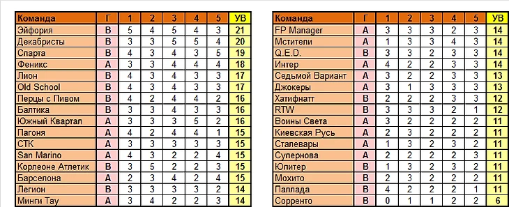 Лучшая команда тура по сумме УВ в целом: Эйфория (21 вариант)