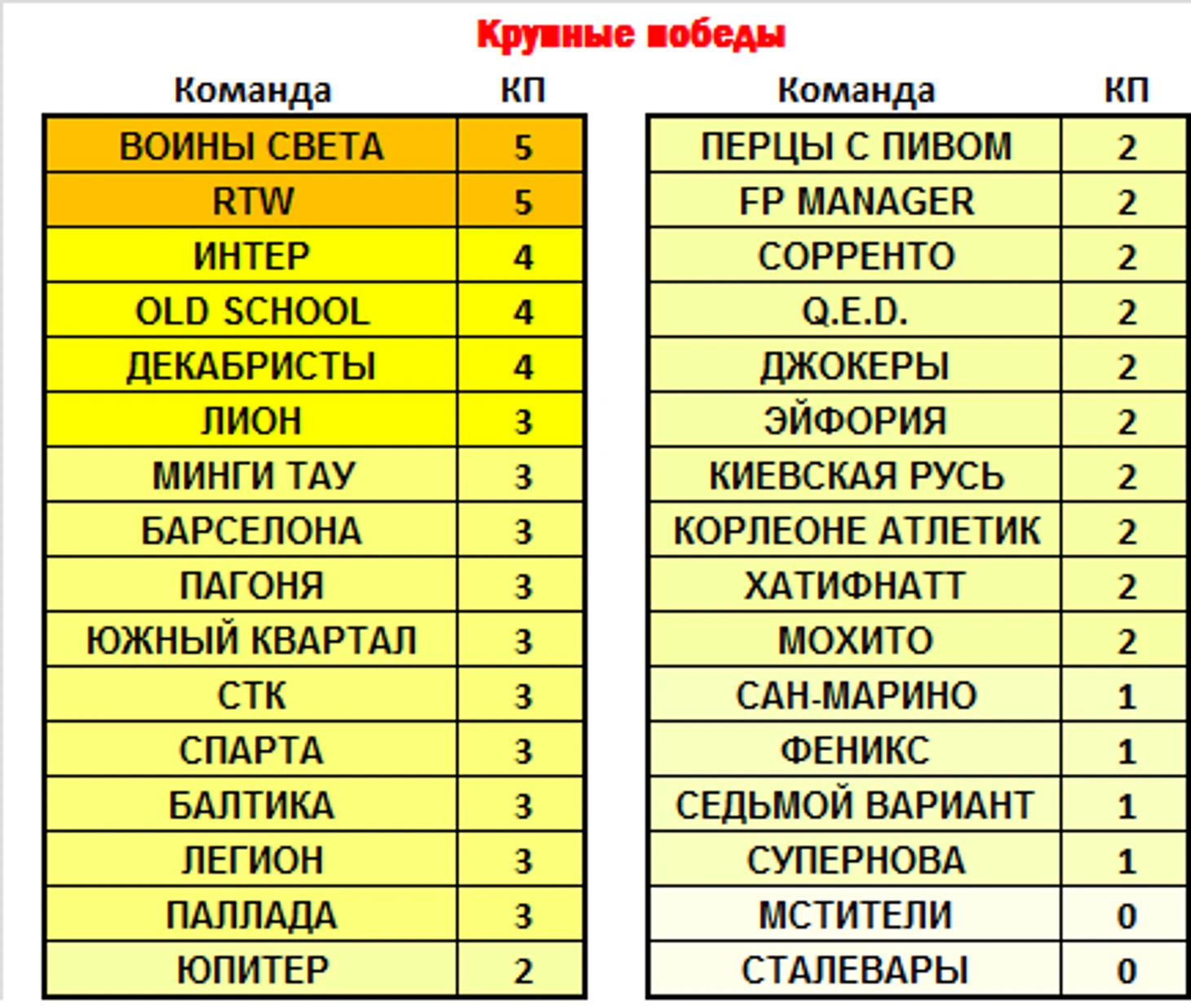 RTW одержали и больше всего крупных побед по ходу этапа, наряду с Воинами Света. У Минги Тау таковых в активе 3, у победителя группы В Юпитера лишь 2. Две команды, Мстители и Сталевары, соперников своих не громили, максимальная разница их выигрышей составляла 2 мяча.
