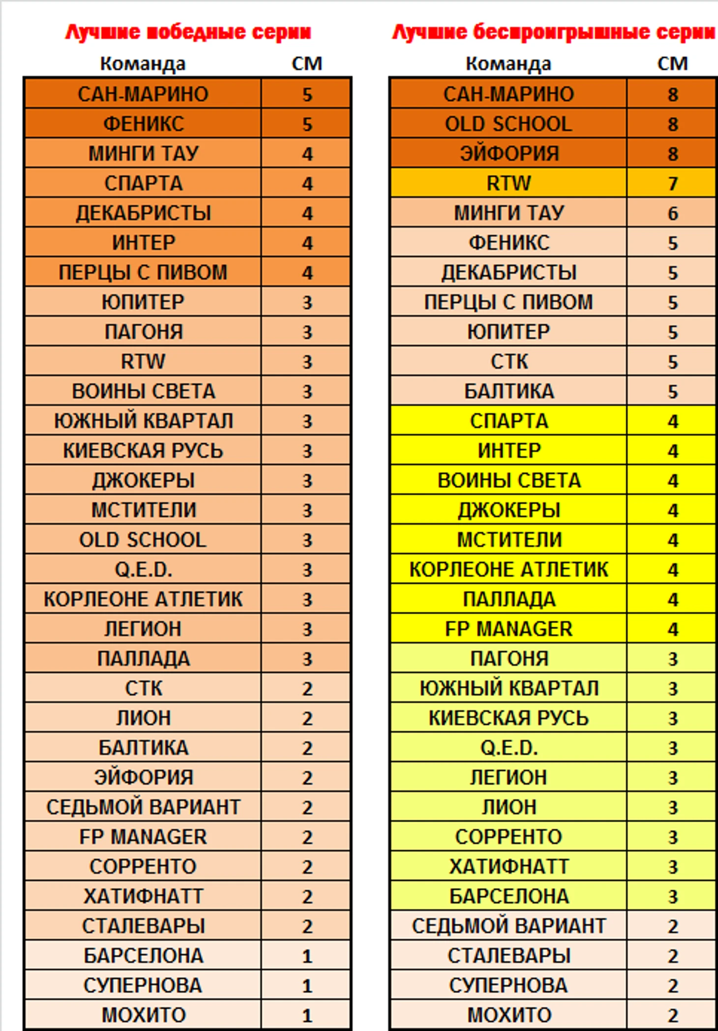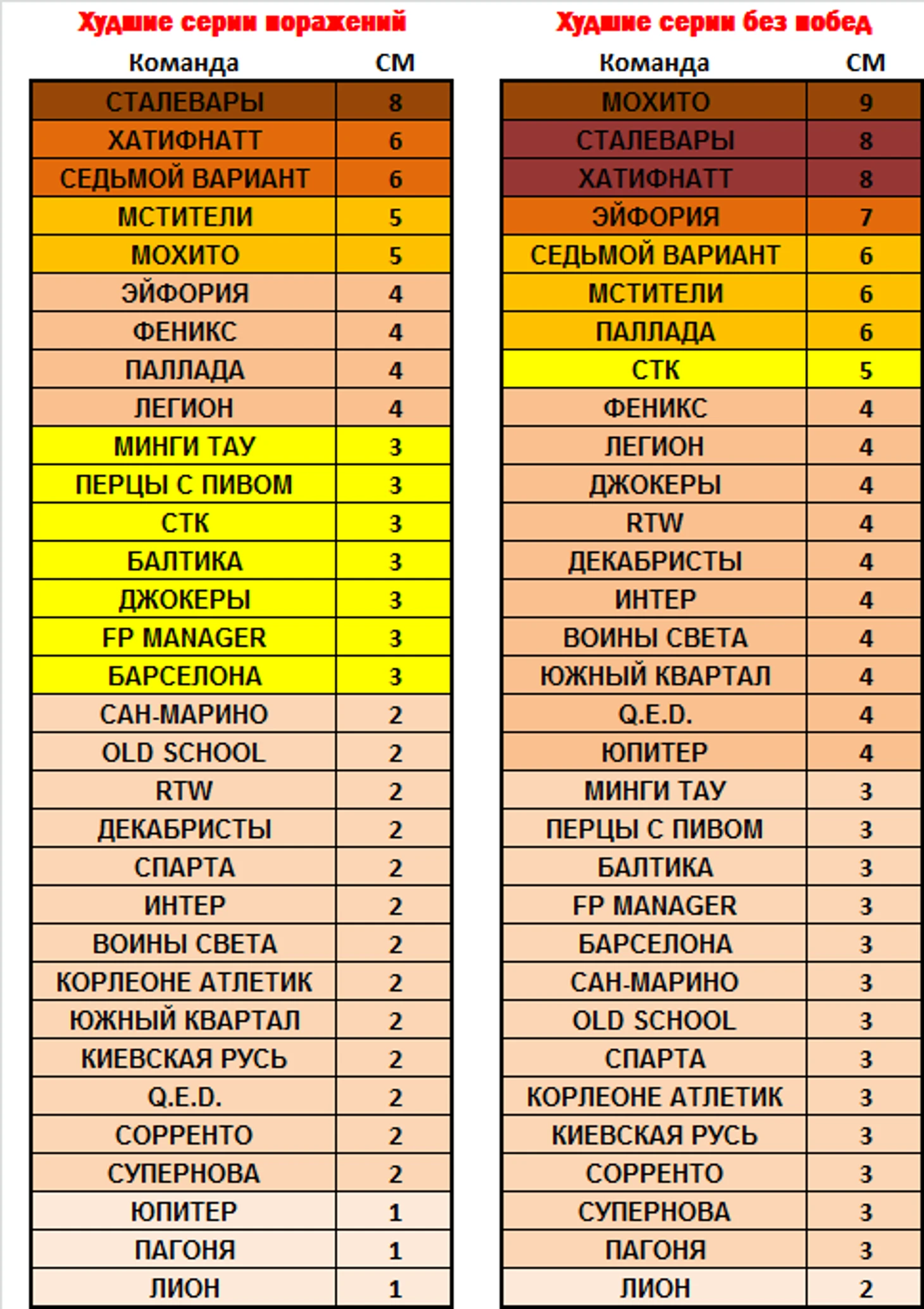 Наиболее долгое наслаждение от побед испытывали "республиканцы" из Сан-Марино и Феникс, спуртовавший после 4 поражений на старте. Сан-маринцам принадлежит и рекордная беспроигрышная серия сезона из 8 туров, разделили с ними это достижение Old School и Эйфория. Да, и эйфы при такой серии оказались в зоне 13-16, проблема в том, что 5 матчей внутри неё завершались вничью, и обрамлена эта серия была двумя безрадостными, 3-х и 4-х матчевыми.